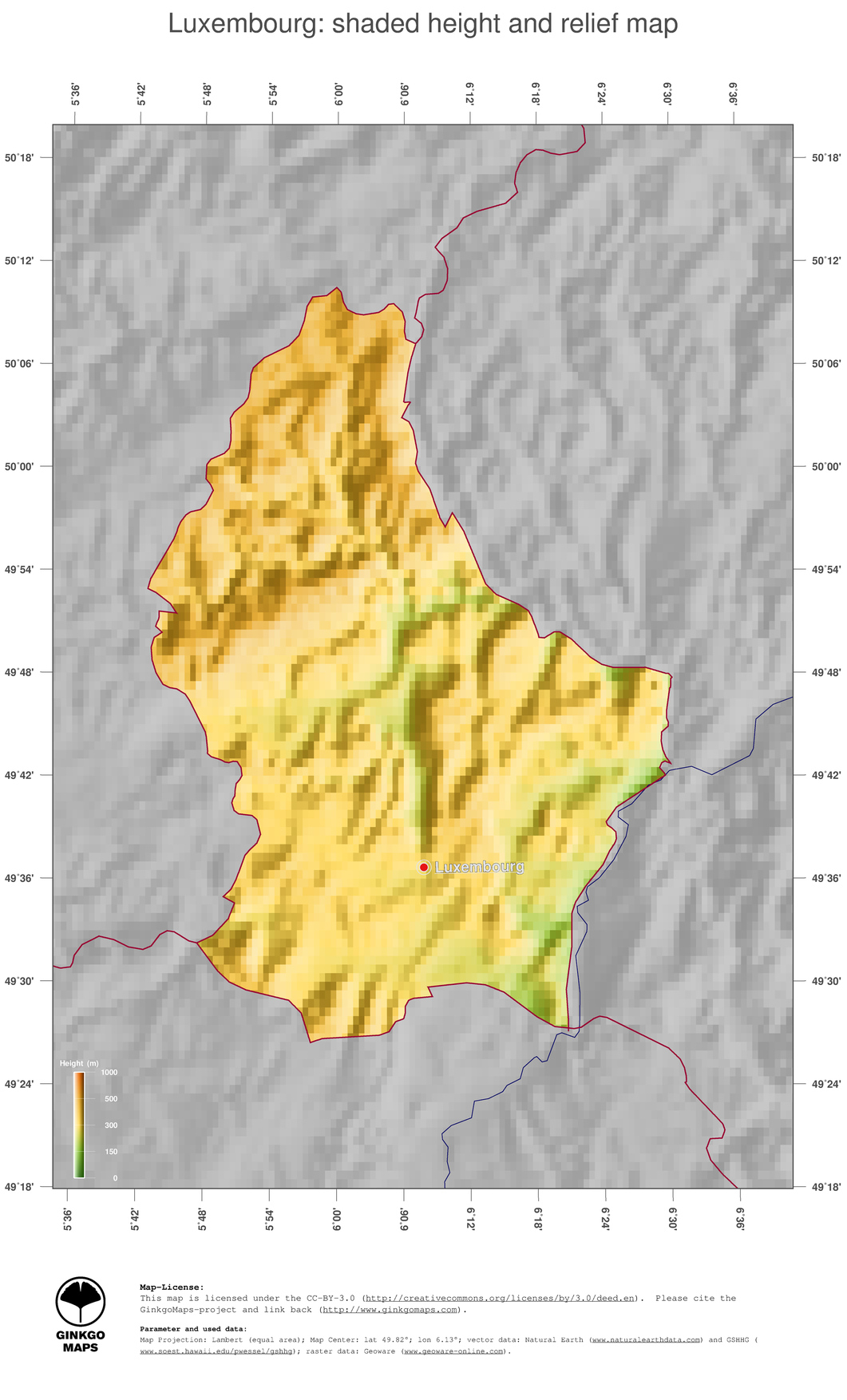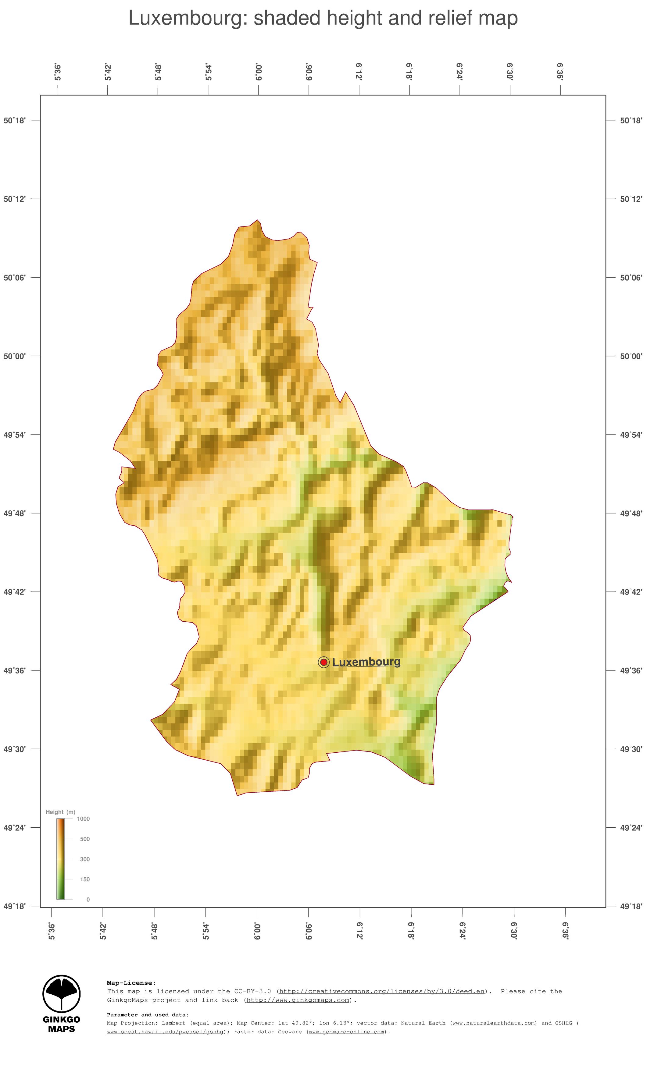 #3 Map Luxembourg: color-coded topography, shaded relief, country borders and capital