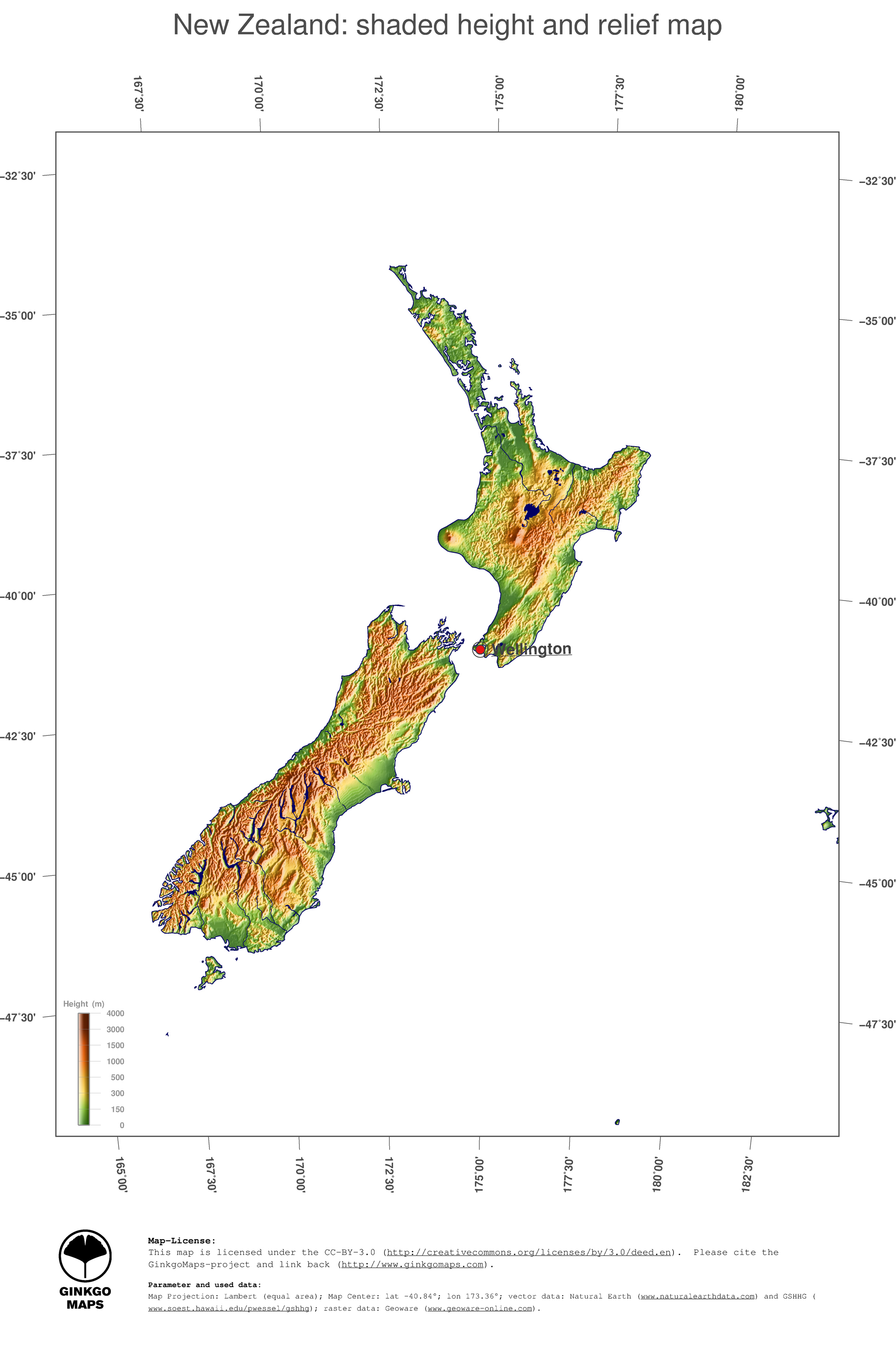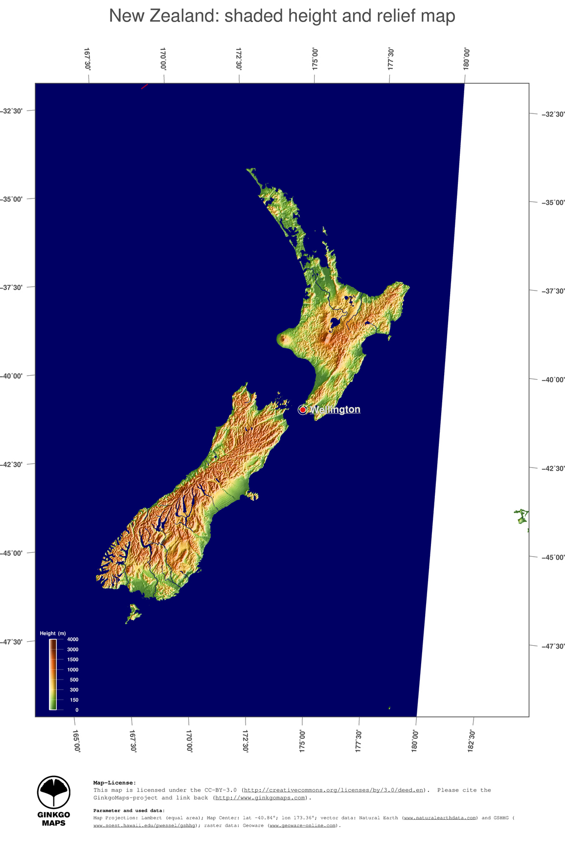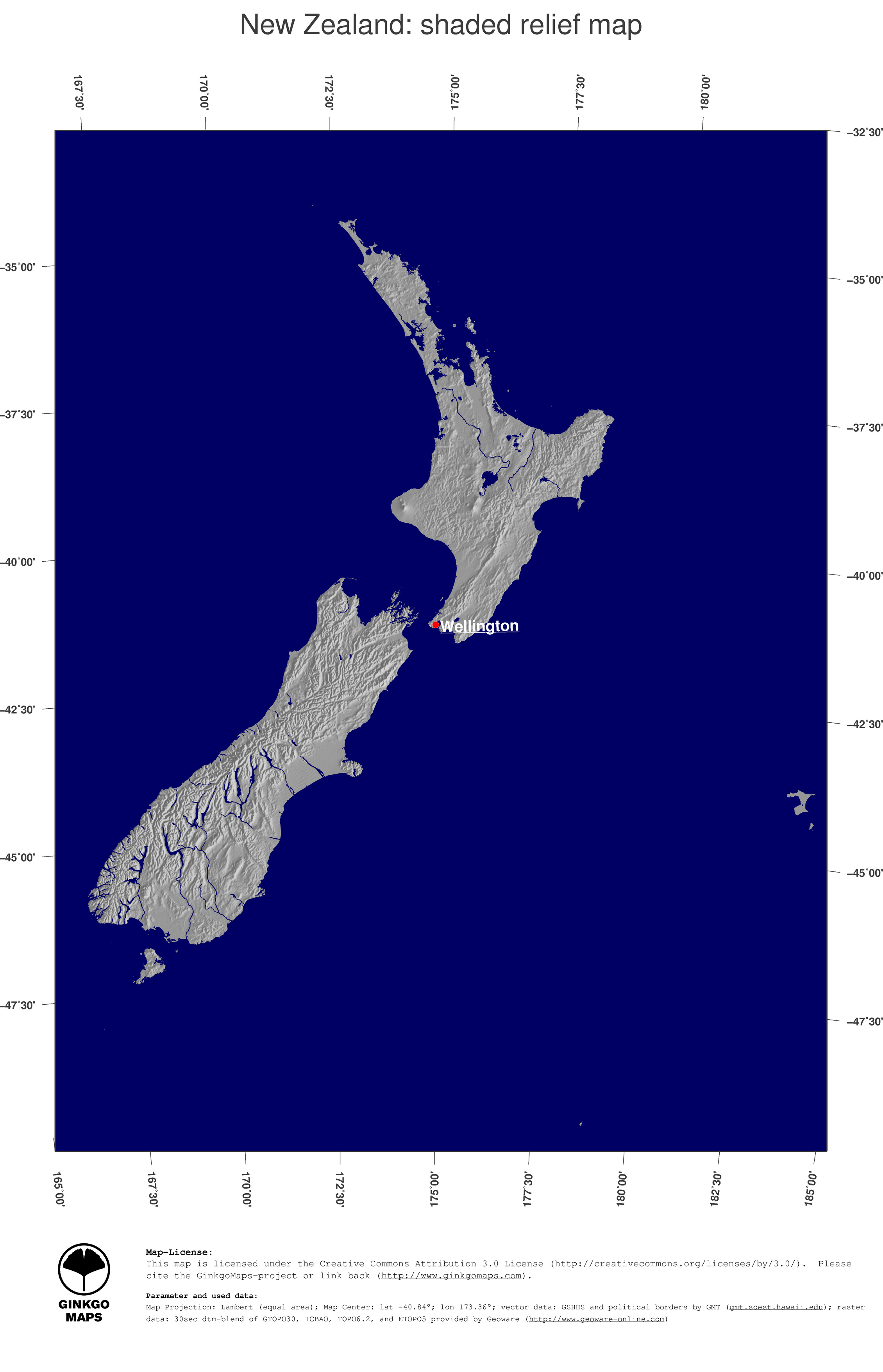 #3 Map New Zealand: color-coded topography, shaded relief, country borders and capital